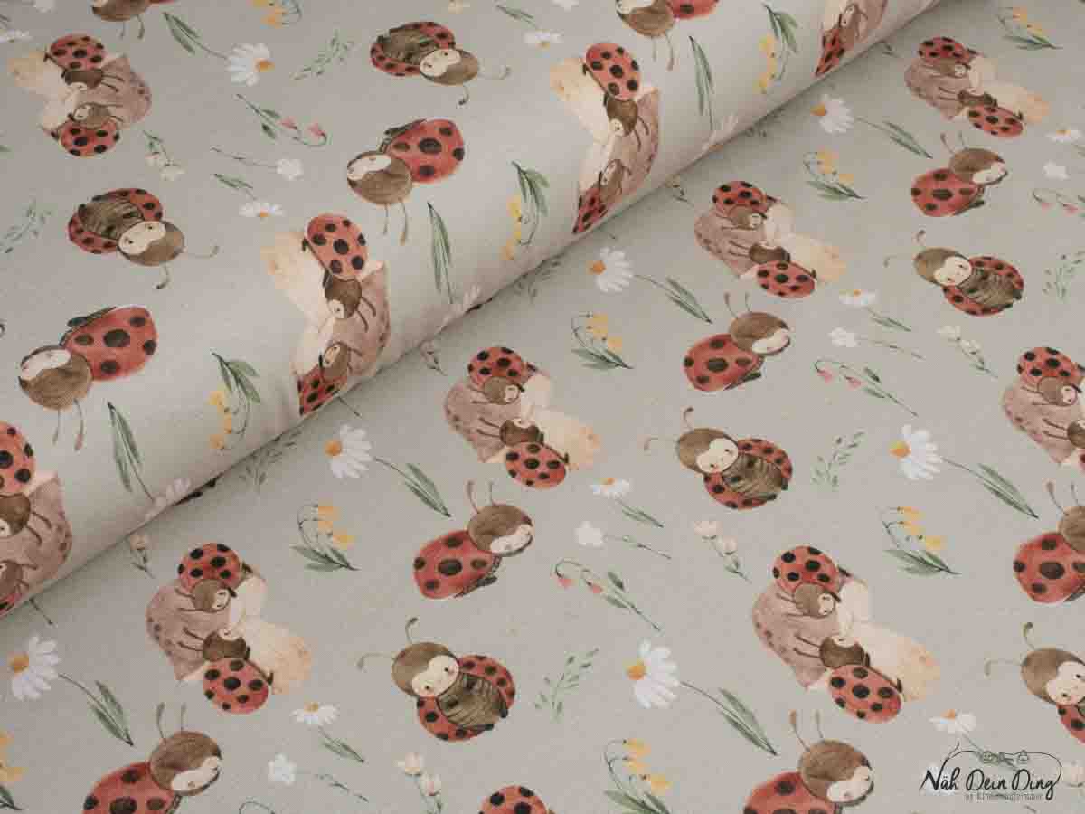 Marienkäfer, Pilze und Frühlingsblumen auf Baumwolljersey.