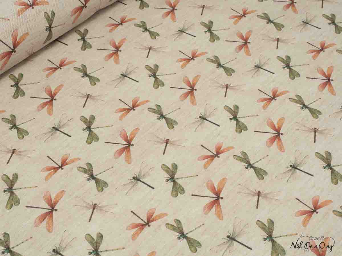Beschichtete Baumwolle in natur-beige mit Libellen in orange und grün.