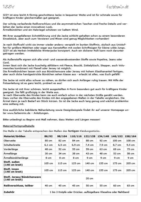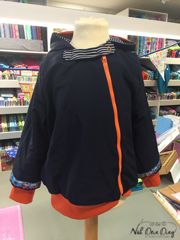 Die Hingucker bei dieser Jacke sind der schräg verlaufende Reißverschluß und die große Bauchtasche. Sie fällt großzügig in der Weite aus und kann wunderbar auch mit kuscheligen Stoffen für die kältere Jahreszeit gefüttert werden.