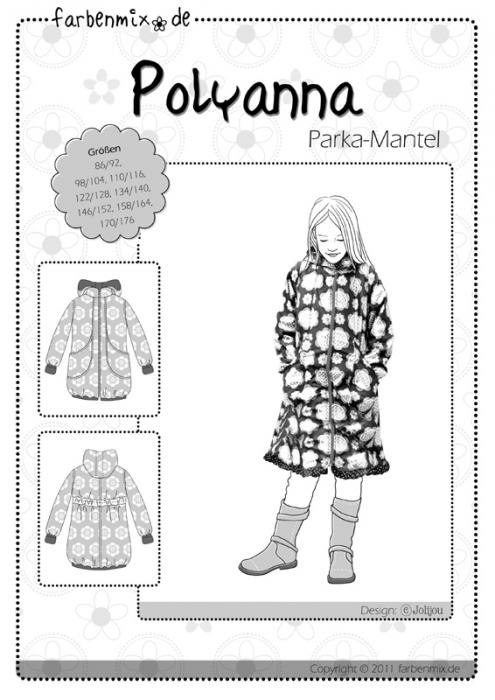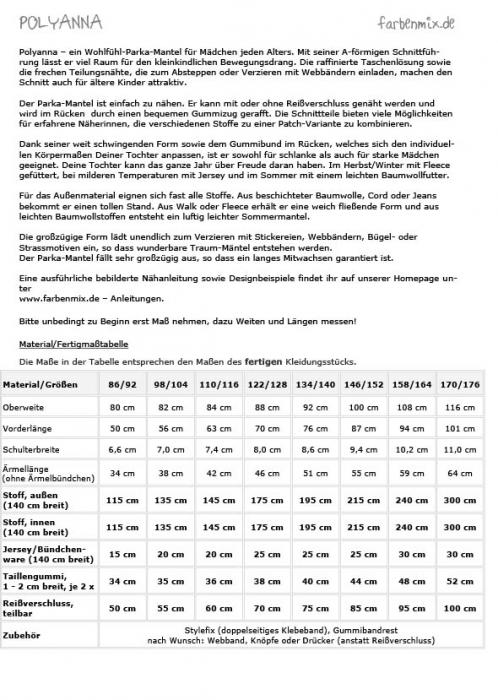 Der Parka wird gefüttert, im Sommer mit Baumwolle, im Übergang mit Jersey und im Winter mit Fleece und kann sowohl mit als auch ohne Reißverschluß genäht werden.