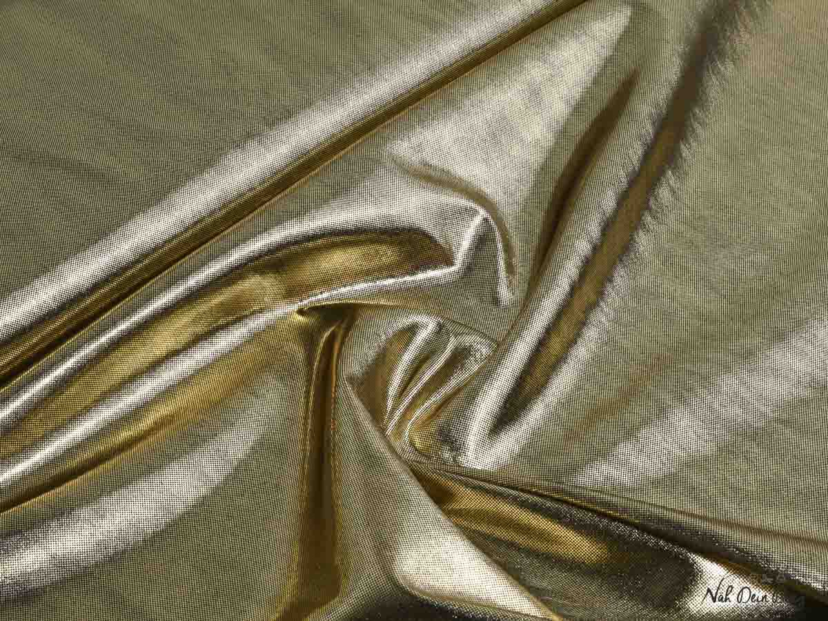 Goldener Foliendruck auf schwarzem Polyestergewebe. D.h., die Rückseite ist schwarz.