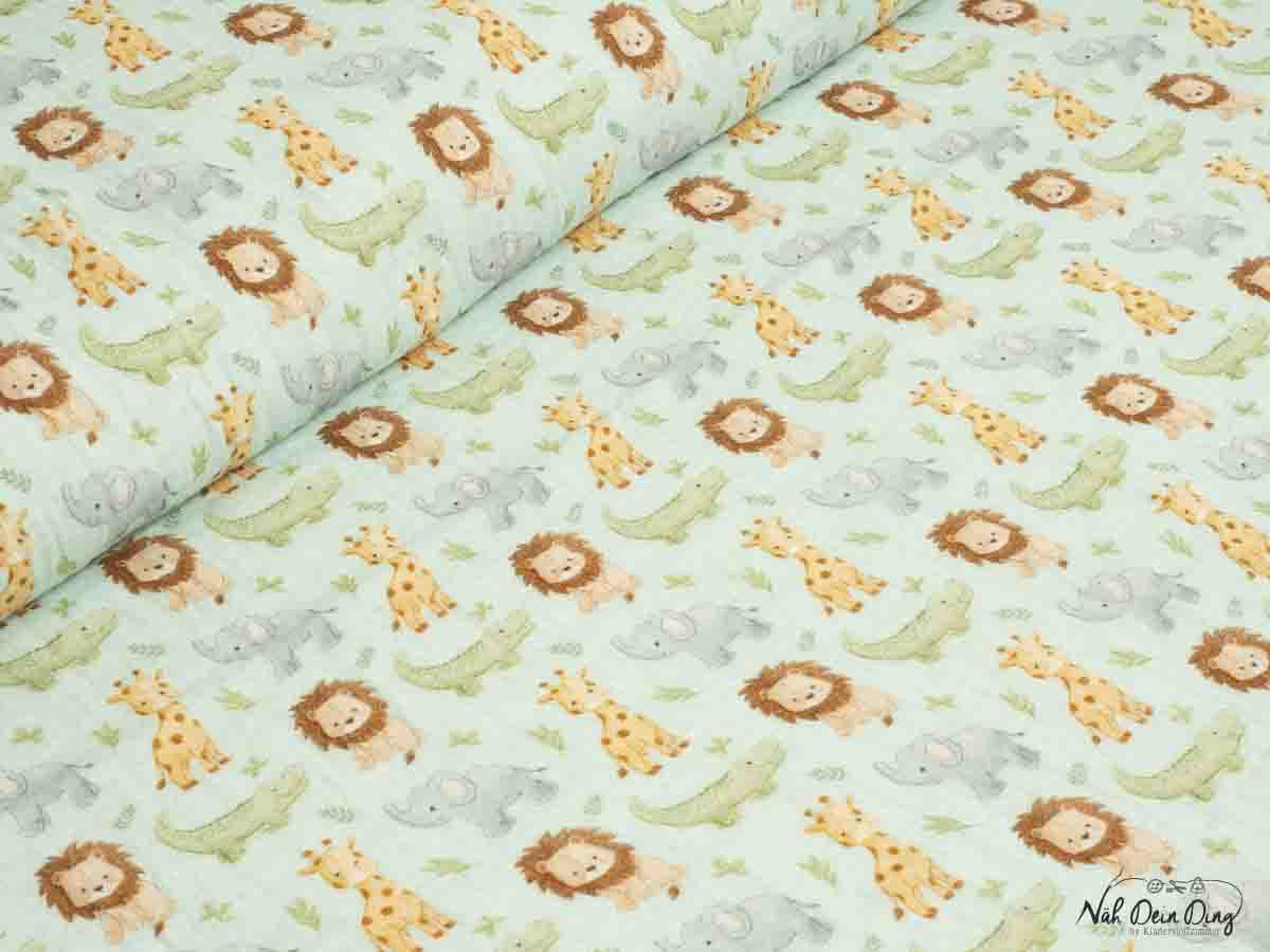 Wunderbar weicher Double Gauze Musselin, bedruckt mit niedlichen Tieren auf blauem Hintergrund. Die Rückseite ist weiß. Sehr schön für Kleider, Tücher, Decken, usw.
