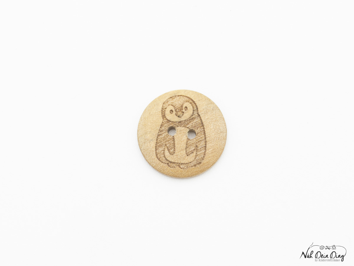 Runder, beigefarbener Knopf aus Holz. Mit eingefrästem Pinguin-Motiv.