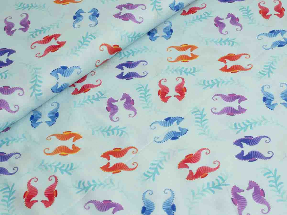 Niedliche Seepferdchen-Pärchen auf hellblauem Hintergrund.