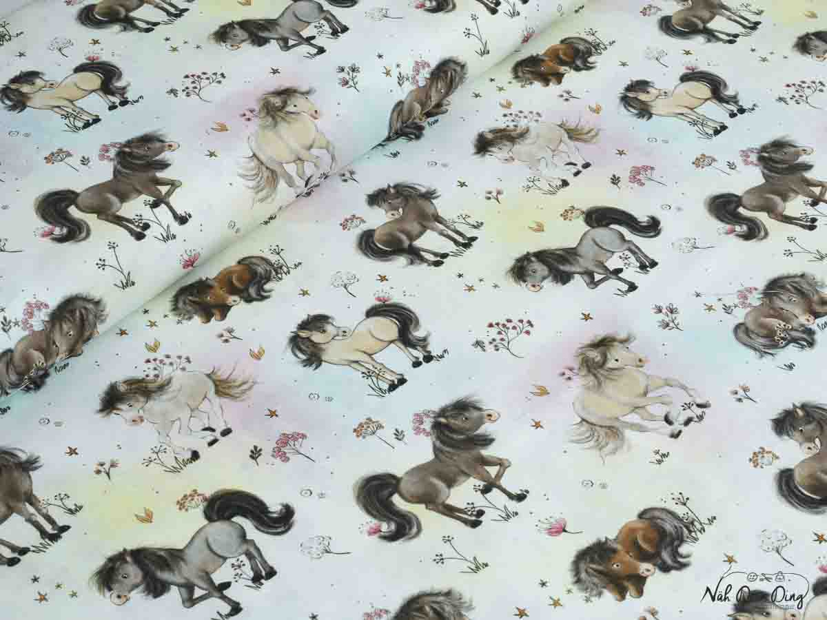 Feiner Baumwollstoff bedruckt mit niedlichen Pferdchen auf regenbogenbuntem Hintergrund.