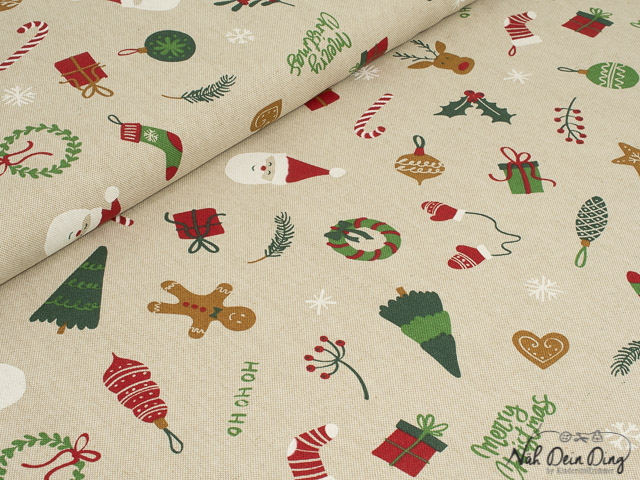 Weihnachtliche Symbole auf beigefarbenem Deko-Canvas.