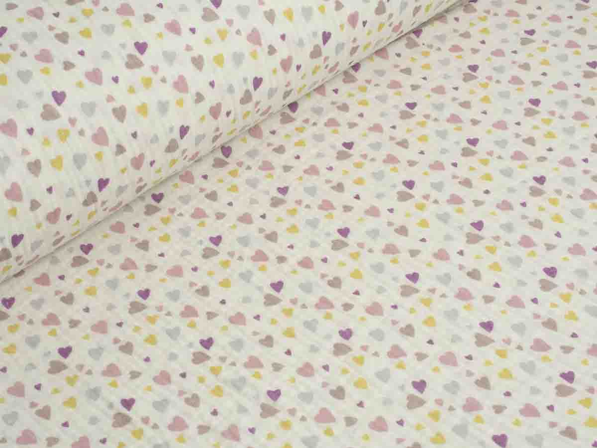 Weicher Musselin/Double Gauze mit Herzchen in unterschiedlichen Größen und zarten Farben auf cremeweißem Hintergrund. Die Rückseite ist einfarbig cremeweiß.