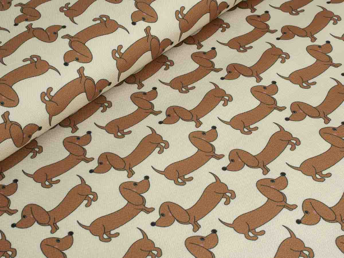 Outdoorgeeigneter, wasserdichter Polyesterstoff mit lustigem, trendigem Dackelmotiv.