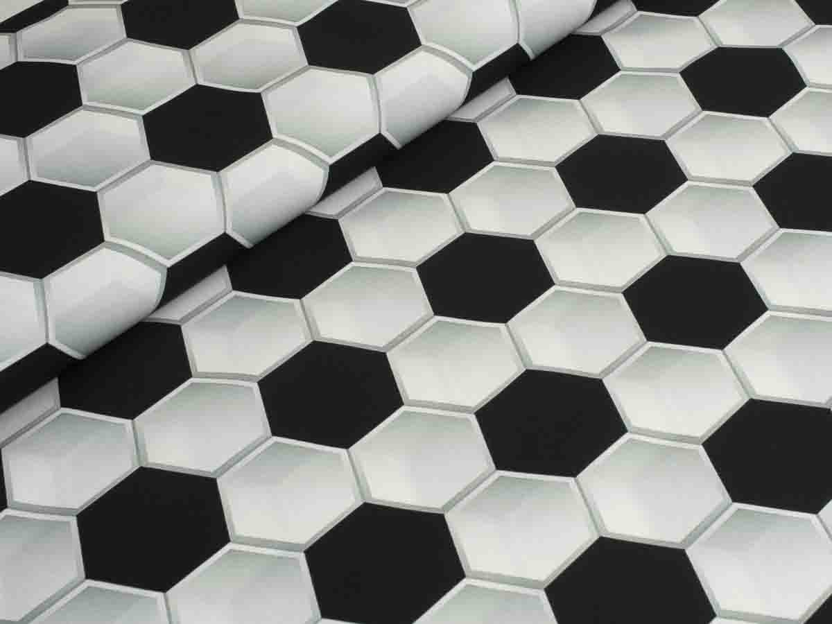 Fußballmuster auf Baumwoll-Webware in 3-D-Effekt-Optik.