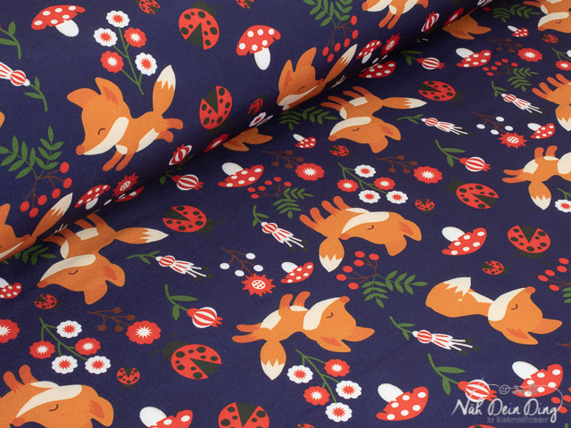 Füchse, Marienkäfer, Fliegenpilze und Blumen auf dunkelblauem Hintergrund.