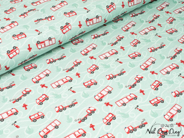 Leicht angerauhter Sweat mit kleinen roten Feuerwehrfahrzeugen auf mintfarbenem Hintergrund.
