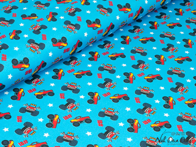 Angerauter Sweat mit roten Monstertrucks.