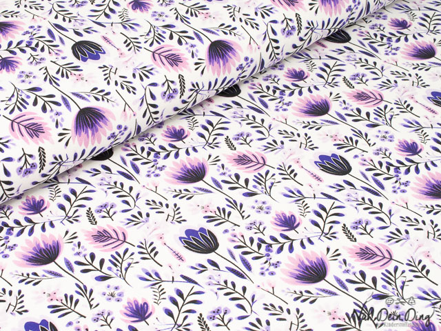 Kuschelig angerauhter Sweat mit in lila und pinken Blumen auf weißem Hintergrund.