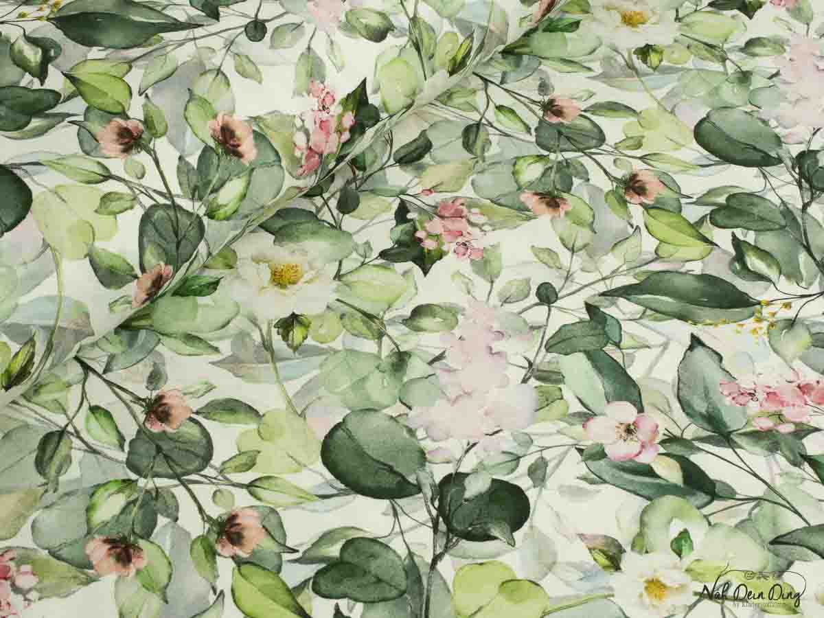 Eukalyptus Blätter und Blüten auf Baumwolljersey.