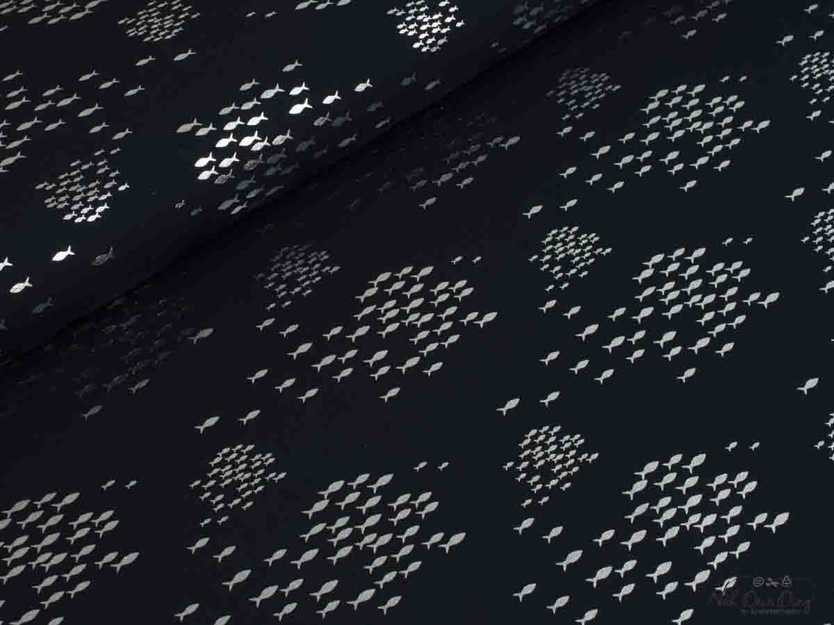 Dunkelblauer Baumwolljersey, bedruckt mit metallic-silbernen Glitzerfischen.