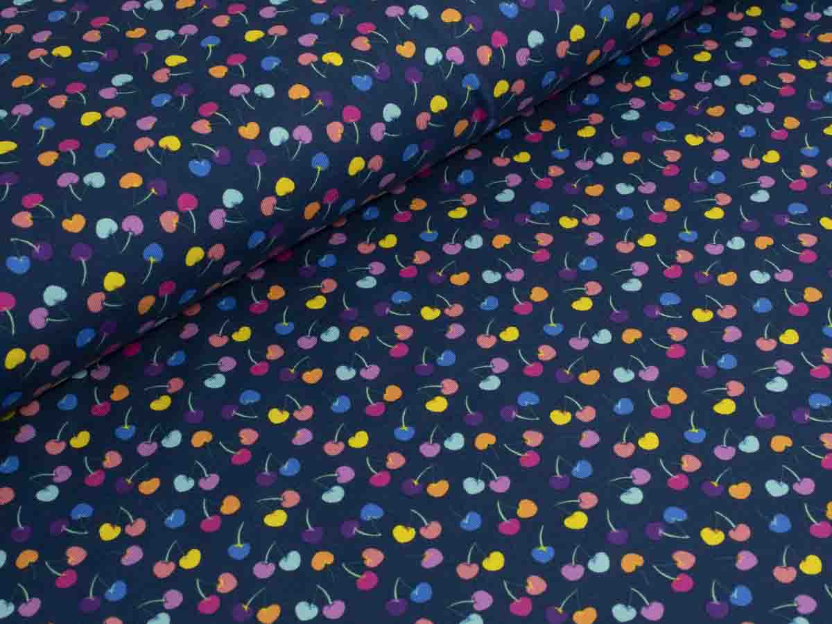 Baumwolljersey mit bunten Kirschen auf dunkelblauem Hintergrund.