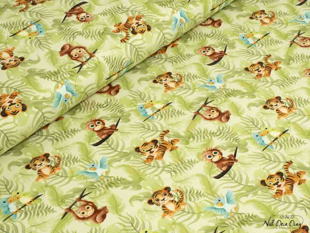 Baby-Dschungeltiere, wie Affen, Papageien und Tiger auf Baumwolljersey.