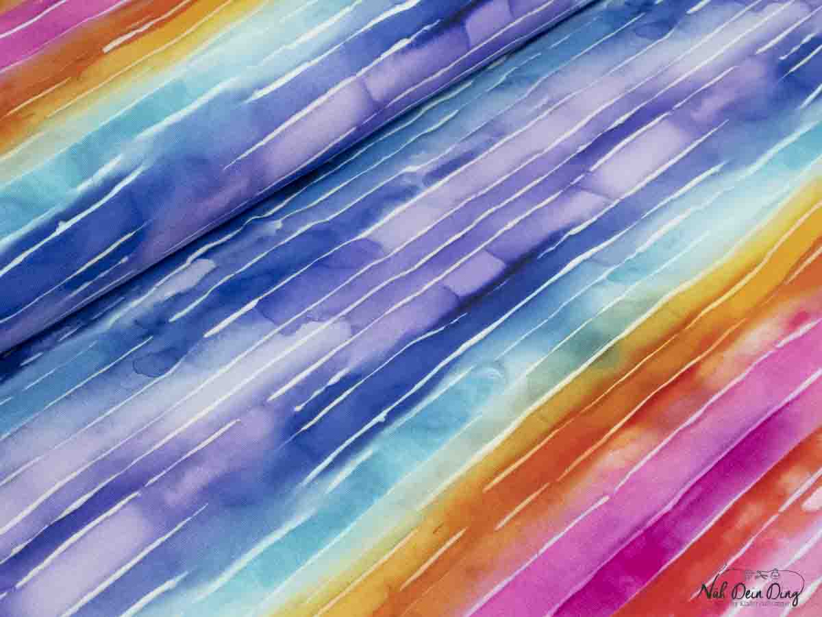 Baumwolljersey mit unregelmäßigen, aquarellartigen Regenbogenringeln.