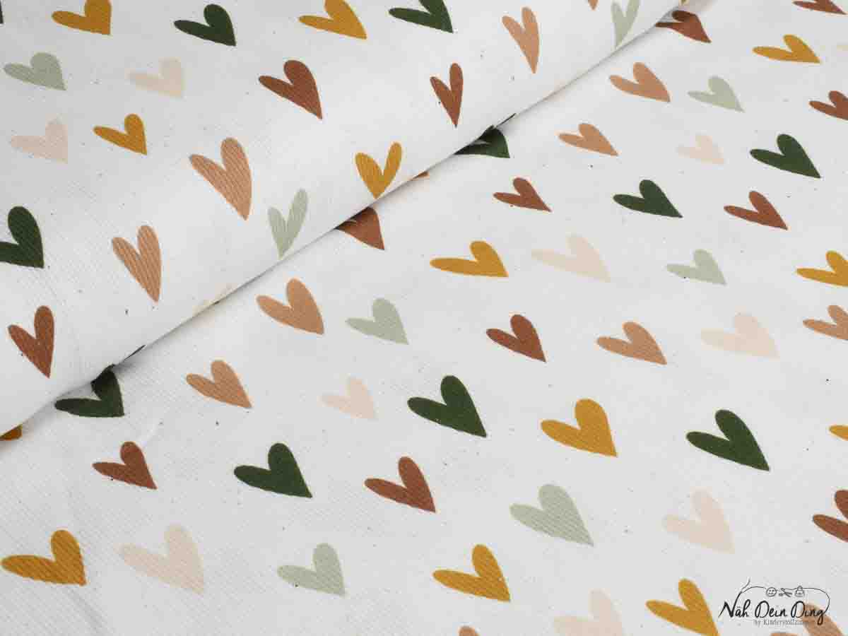 Gesprenkelter Rippjersey in weiß mit Herzen in Erdfarben.