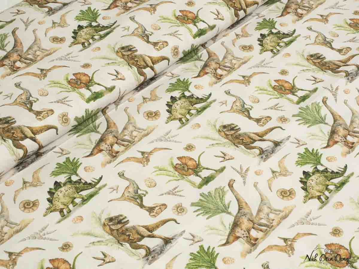 Realistisch dargestellte Dinosaurier verschiedener Arten auf beigefarbenem Hintergrund.