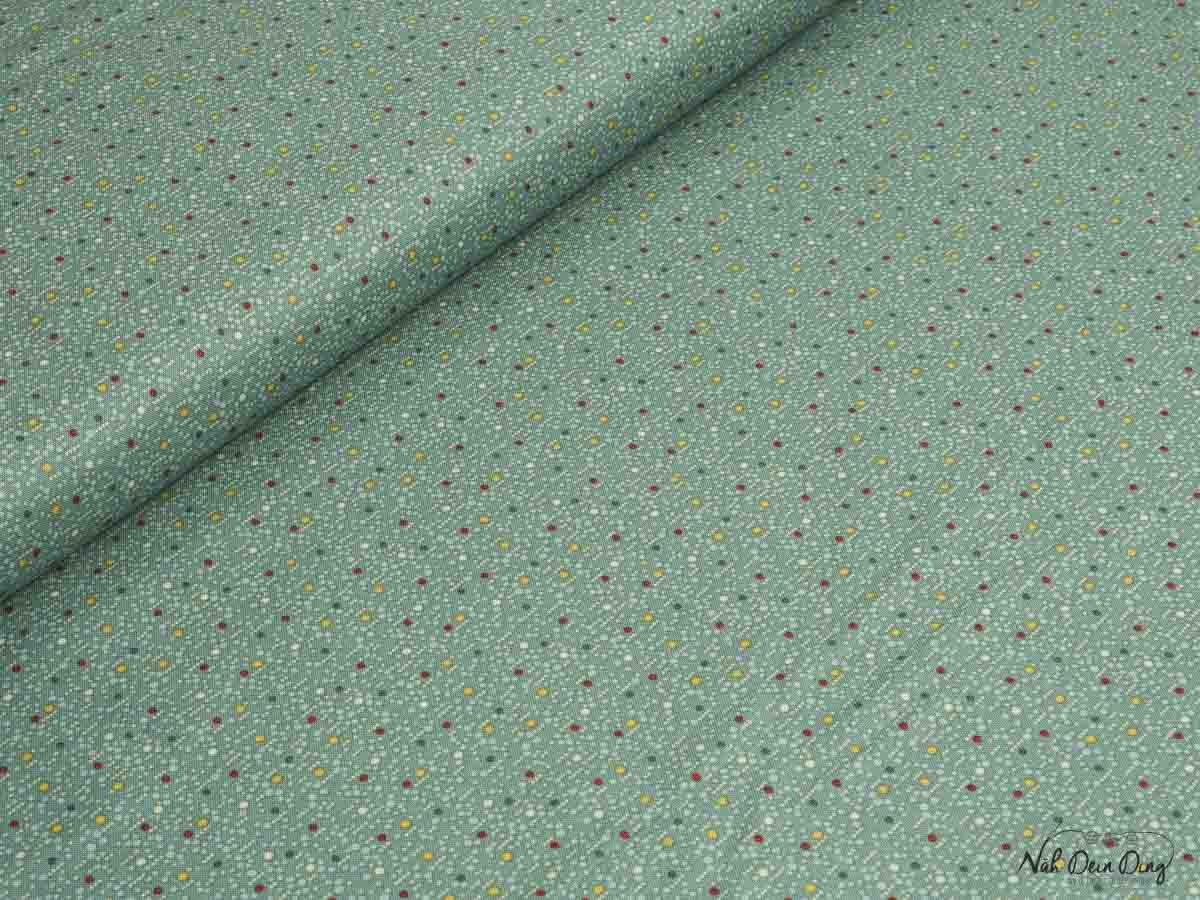 Bunte Pünktchen unterschiedlicher Art und Größe auf einem Hintergrund in darkmint.