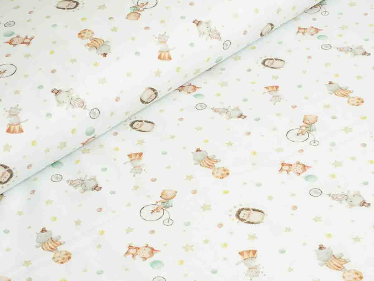 Baumwoll-Pique bedruckt mit kleinen jonglierenden Igeln, Hochrad fahrenden Bären, Einrad fahrenden Elefanten, usw.