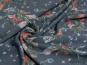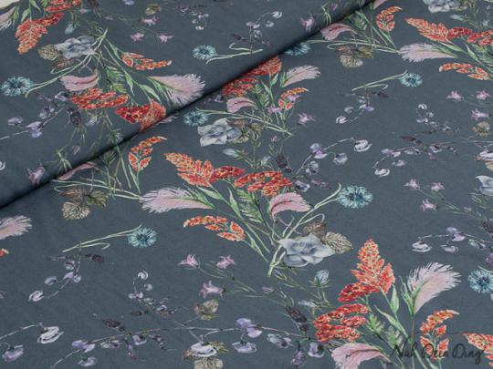 Viskosestoff für Blusen, Kleider, Schals oder Röcke, graugrundig mit bunten Blumen und Gräsern bedruckt.