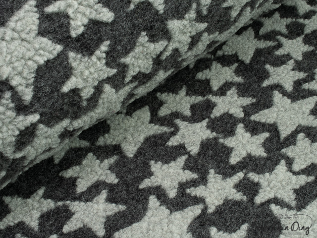 Dunkelgrauer Wollwalk mit hellgrauen Sternen in verschiedenen Größen. Daraus lassen sich Jacken, genauso wie Stulpen, Röcke für große und kleine Kinder und Damen,