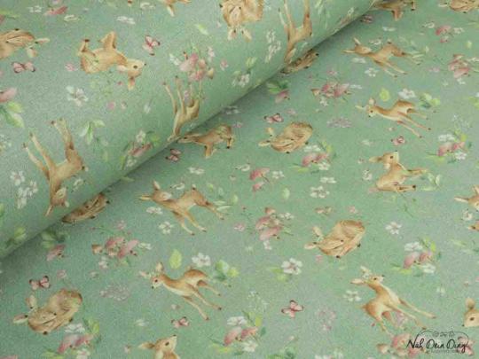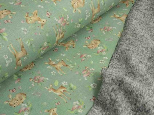 Sweat in mintgrün mit niedlicen Rehen bedruckt. Die Rückseite ist ein grau melierter, kuscheliger Fleece.